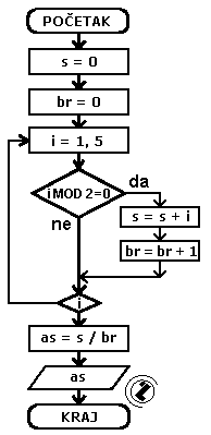 ako je i djeljivo sa 2 tada uvečati: sumu (s=0) i brojač (br=br+1)