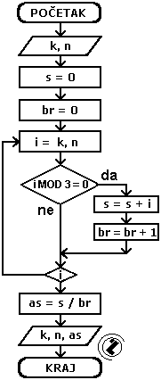ako je i djeljivo sa 3 tada uvečati: sumu (s=0) i brojač (br=br+1)