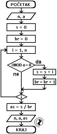 ako je i djeljivo sa a tada uvečati sume (s=0) i brojač (br=br+1)