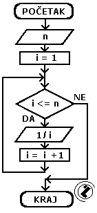 - dok je i manje ili jednako n (i<=n) pređi na slijedeće korake; inače idi na nastavak programa (korak 7)
