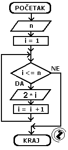 - dok je i manje ili jednako n (i<=n) pređi na slijedeće korake; inače idi na nastavak programa (korak 7)