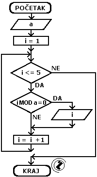 - dok je i manje ili jednako 5 (i <= 5) pređi na slijedeće korake; inače idi na nastavak programa (korak 7)