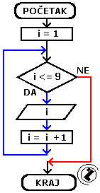 - dok je i manje ili jednako 9 (i <= 9) pređi na slijedeće korake; inače idi na nastavak programa (korak 6)