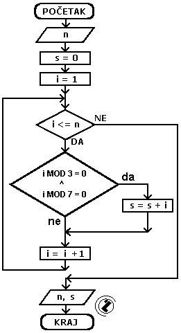 - ako je i djeljivo sa 3 i sa 7 formirati novu sumu (s=s+i)
