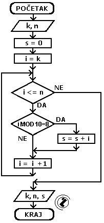 - ako je cifra jedinica promjenljive i 8 formirati novu sumu (s=s+i)