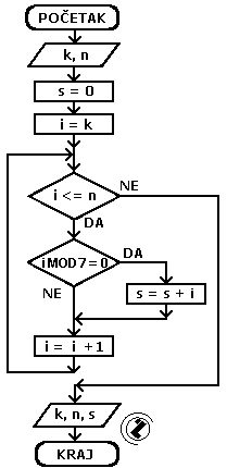 8.2.. Izračunati sumu prirodnih brojeva u intervalu od k do n koji su djeljivi sa 7.