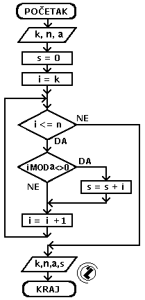 - ako i nije djeljivo sa a formirati novu sumu (s=s+i)