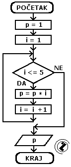 - dok je i manje ili jednako 5 (i<=5) pređi na slijedeće korake; inače idi na nastavak programa (korak 7)