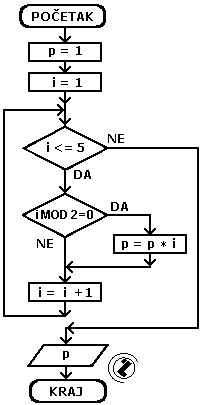 - dok je i manje ili jednako 5 (i<=5) pređi na slijedeće korake; inače idi na nastavak programa (korak 7)