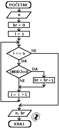 - ako je i nije djeljivo sa 2 uvećati vrijednost brojača br (br=br+1)
