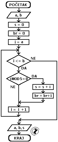 8.2.. Naći sumu brojeva u intervalu od a do b djeljivih sa 5 i koliko ih ima.