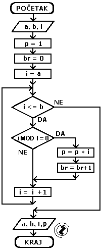 - ispisati granice (a,b), broj za provjeru (l) i izračunate vrijednosti proizvoda (p) i brojača (br =0)