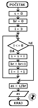 - dok je i manje ili jednako 8 (i<=8) pređi na slijedeće korake; inače idi na nastavak programa (korak 7)