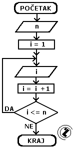 - sve dok je promjenljiva i manja ili jednaka n idi na korak 3 inače izađi iz petlje