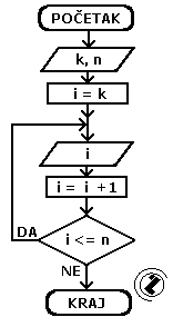 - uvećaj vrijednost kontrolne promjenljive (i=i+1)