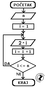 - sve dok je promjenljiva i manja ili jednaka n idi na korak 3 inače izađi iz petlje