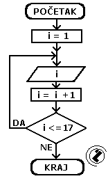 - sve dok je promjenljiva i manja ili jednaka od 17 (i <= 17) idi na korak 2, inače izađi iz petlje