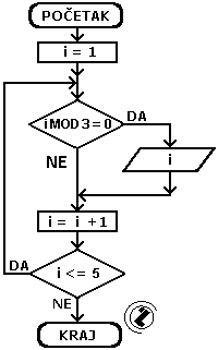 - sve dok je promjenljiva i manja ili jednaka 5 idi na korak 2 inače izađi iz petlje