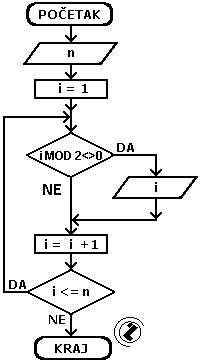 - sve dok je promjenljiva i manja ili jednaka n idi na korak 3 inače izađi iz petlje