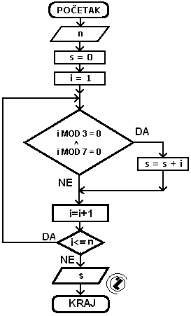 - ako je i djeljivo sa 3 i sa 7 formirati novu sumu (s=s+i)