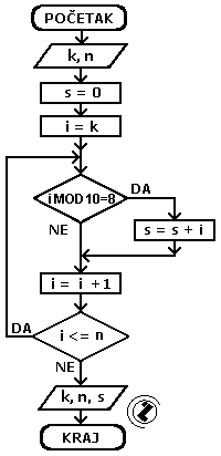 - ako je cifra jedinica promjenljive i 8 formirati novu sumu (s=s+i)