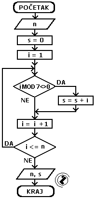 - ako i nije djeljivo sa 7 formirati novu sumu (s=s+i)