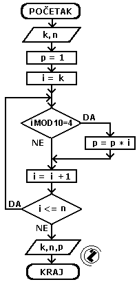 - ako je cifra jedinica 4 (ostatak dijeljanja sa 10 je 4) tada formirati novi proizvod (p=p*i)