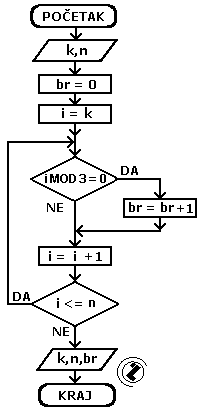 8.3.. Napisati program za prebrojavanje prirodnih brojeva koji su djeljivi sa 3 u intervalu od k do n.