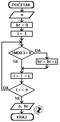 - ako je i djeljivo sa 3 uvećati vrijednost brojača (br=br+1)