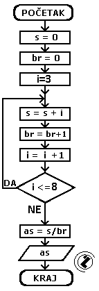- sve dok je promjenljiva i manja ili jednaka 8 idi na korak 3 inače izađi iz petlje