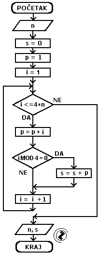 - dok je i manje ili jednako n (i<=4*n) pređi na slijedeće korake; inače idi na nastavak programa (korak 8)