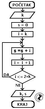 - dok je kontrolna promjenljiva i <= 2*k ponovi petlju (idi na korak 6), inače kad je i > 2*k izađi iz petlje