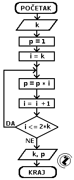 - dok je kontrolna promjenljiva i <= 2*k ponovi petlju (idi na korak 6), inače kad je i > 2*k izađi iz petlje