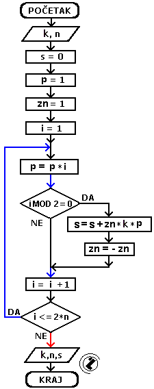 - sve dok je promjenljiva i manja ili jednaka od 2*n (i <= 2*n) idi na korak 5, inače izađi iz petlje