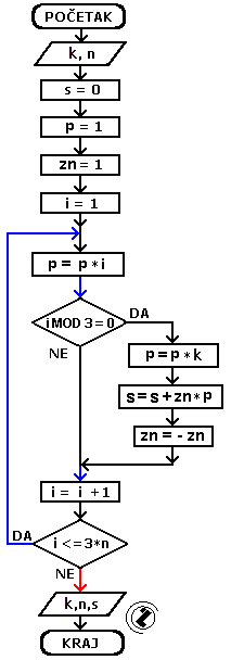 - sve dok je promjenljiva i manja ili jednaka od 3* n (i <= 3*n) idi na korak 5, inače izađi iz petlje