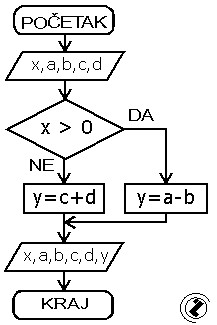 Učitati x, a, b, c, d. Ako je x nije pozitivno y postaje y postaje suma a i b, inače z postaje razlika c i d.