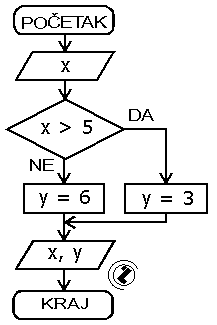 Učitati x. Ako je x veće od pet tada y postaje tri, inače y postaje šest