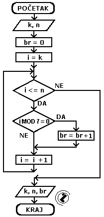 Prebrojati brojeve djeljive sa 7 u intervalu od k do n.