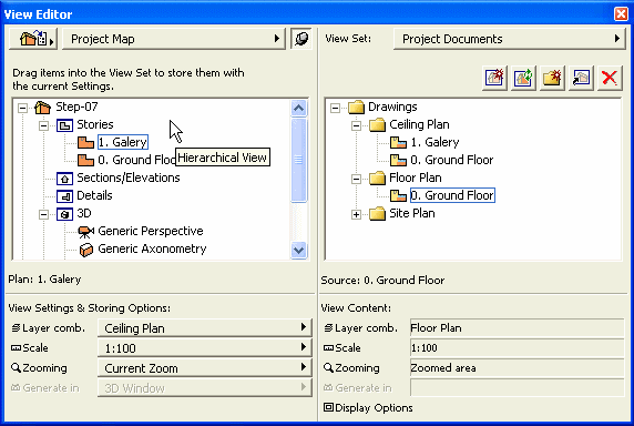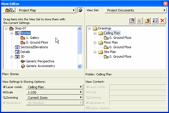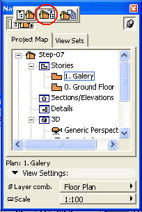 Upotrbom View Editora, kao u koordiniranju projektne dokumentacije, dodelićemo razmeru, opcije displeja, kombinacije lejera i uveličanje crteža za tri tipa crteža: plan tavanice, osnove i situacije. Da podesite poglede kliknite na dugme u gornjem lijevom uglu dijaloga Navigatora, odaberite dugme u sredini da biste aktivirali View Editor.