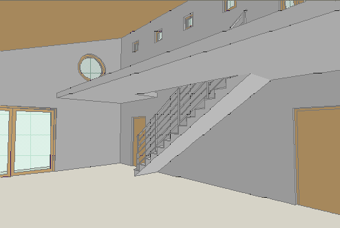 Stepenište je postavljeno u osnovu u tački 2. 750 mm desno od ugla vrata. Pogledajte kako prostorija izgleda kada je stepenište gotovo. Alatka kamera se u ArchiCAD-u koristi za definisanje perspektivnih pogleda. Postavite kameru u prostoriji da vidite kako ona izgleda u perspektivi: