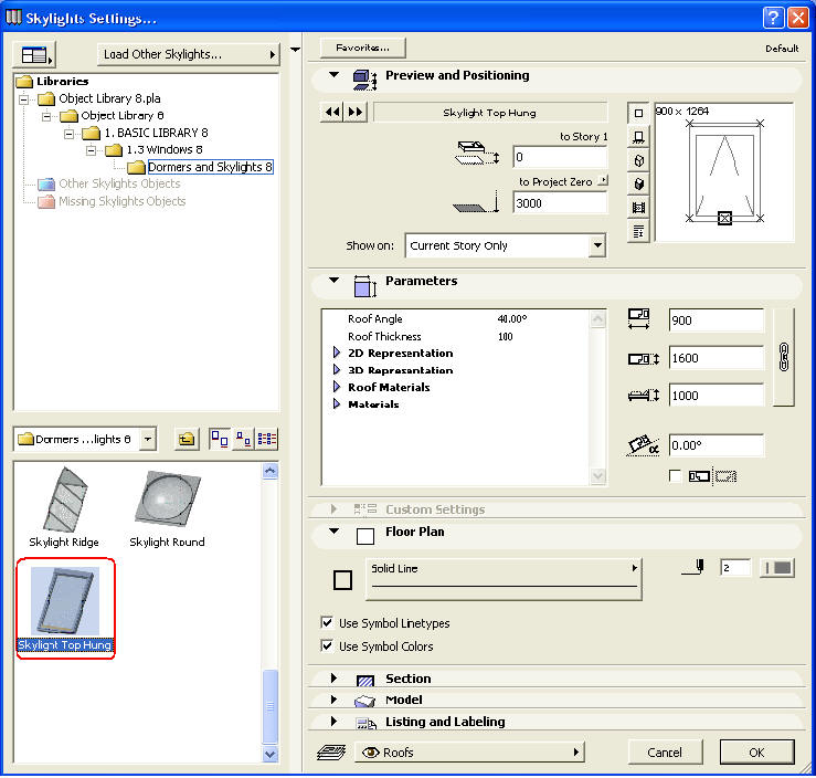 Kliknite dva puta alatku Skylight (krovni prozor) da otvorite dijalog za podešavanje. Odaberite "Skylight Top Hung" iz biblioteke objekata.