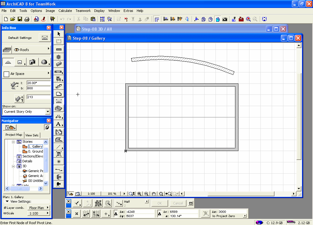 Aktiviranje fantomskog sprata: pozvaćemo meni Options/Stories/Show Ghost story. Sada su elementi prizemlja prikazani svetlo žutom bojom u osnovi galerije. Elemente fantomskog sprata ne možemo koristiti za skok kursora prilikom konstruisanja novih elemenata.