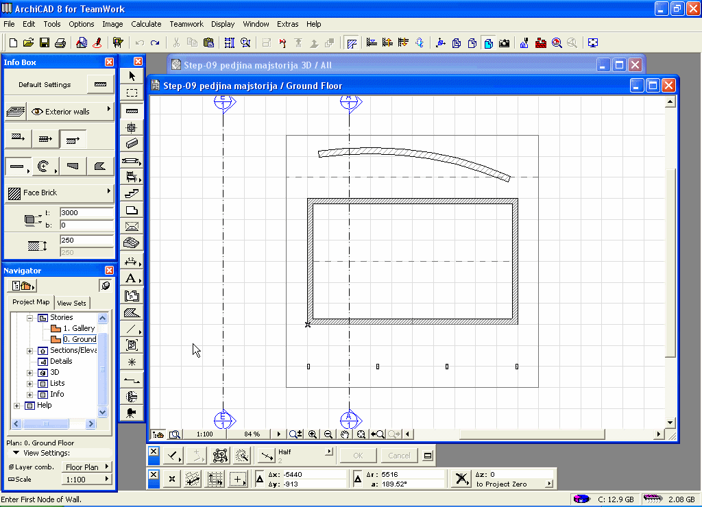 Kliknite na čvorište modularne mreže u tački 1 da započnete crtanje zida.