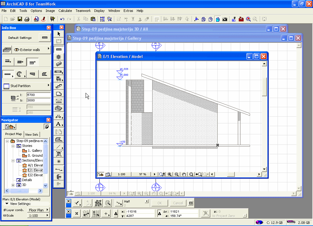 Sada pogledajte kako napredujemo u prozoru preseka. Otvorite prozor preseka A/1 (Window/Sections/Elevations/ A/1 presek (Modela) ). Zakrivljeni zid će služiti kao parapet balkonu te njegovu visinu smanjite na 1200 mm: