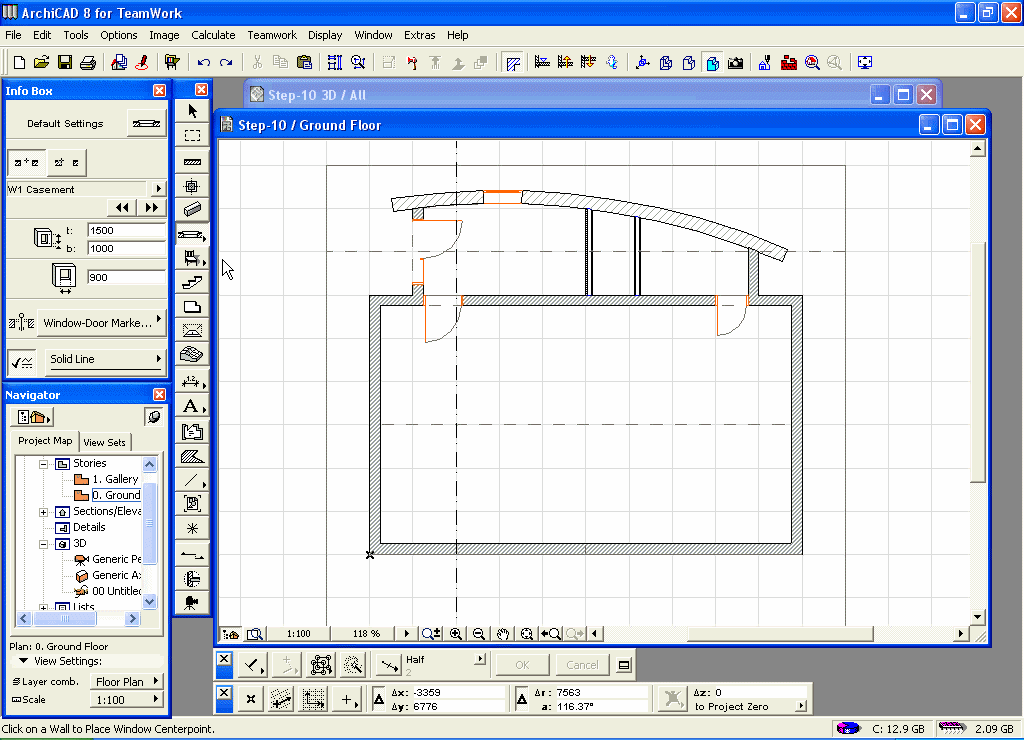 Kliknite na unutrašnje ugaonu tačku donjeg lijevog spoja zidova (tačka br.1).