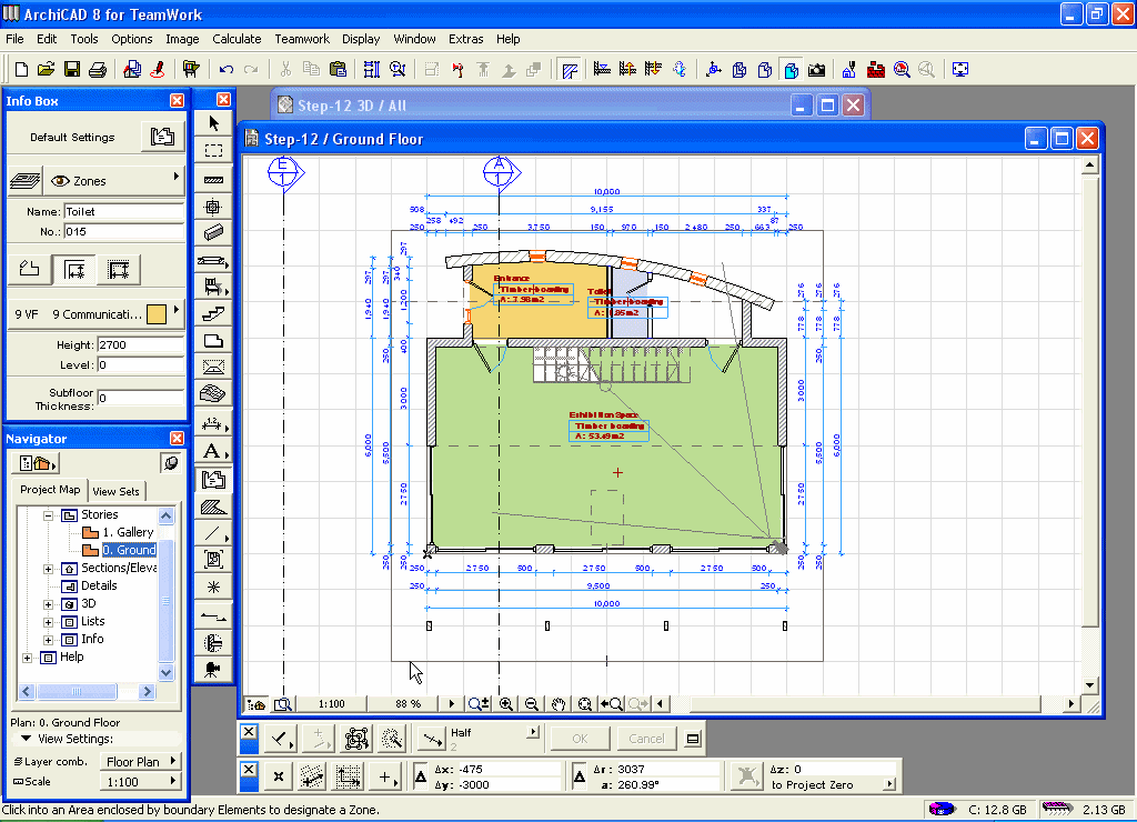 Idite na nivo galerije klikom na njega u paleti Navigatora. Obrise ove zone nacrtaćemo ručno, pošto na jednoj strani nema zida. Za Galeriju upotrebite iste parametre zone kao i za izložbeni prostor. Da nacrtate zonu ručno: