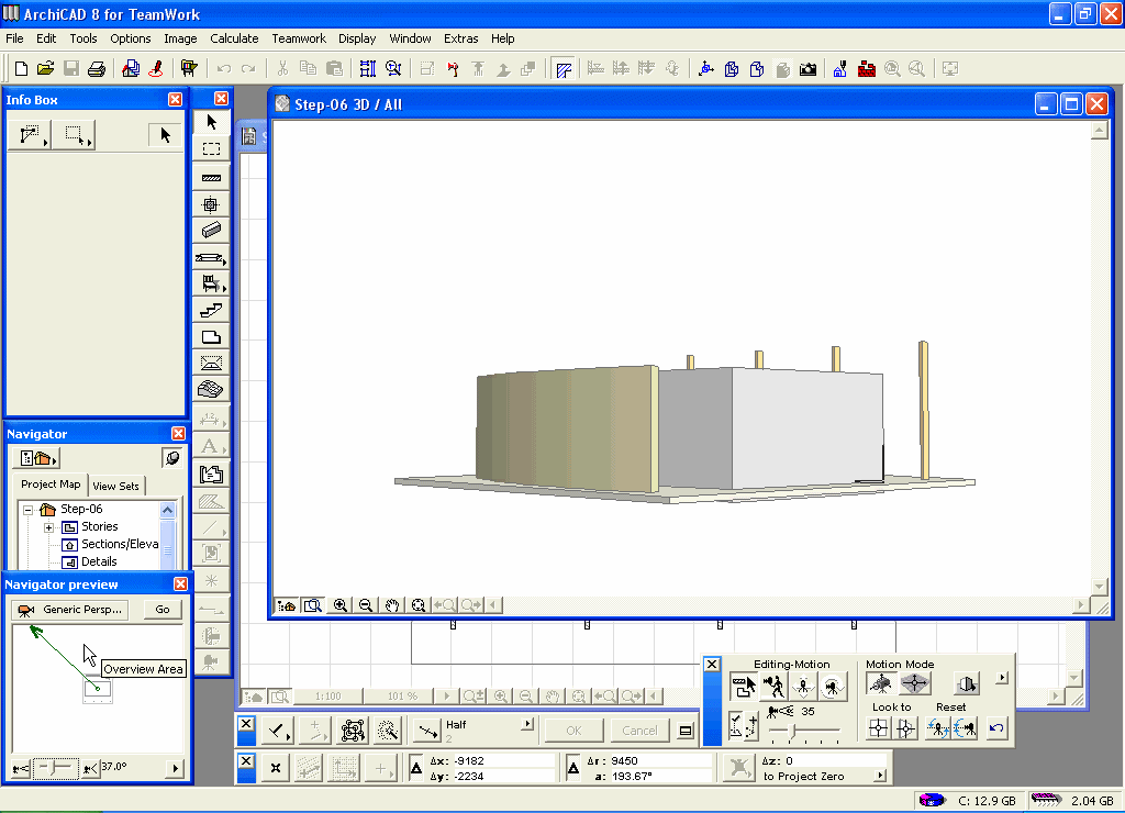 Kretanje uz pomoć kamere Navigatora: U donjem lijevom uglu ekrana, nalazi se paleta prozora za pregled Naigatora: Kliknite na tačku lociranja kamere (#1) i prevucite kursor; slika u 3D prozoru će se izmjeniti u zavisnosti od položaja kamere. Sada odaberite ciljnu tačku kamere i povucite kursor (#2). Takođe možete interaktivno promijeniti uveličanje selektovanjem klizača (#3).