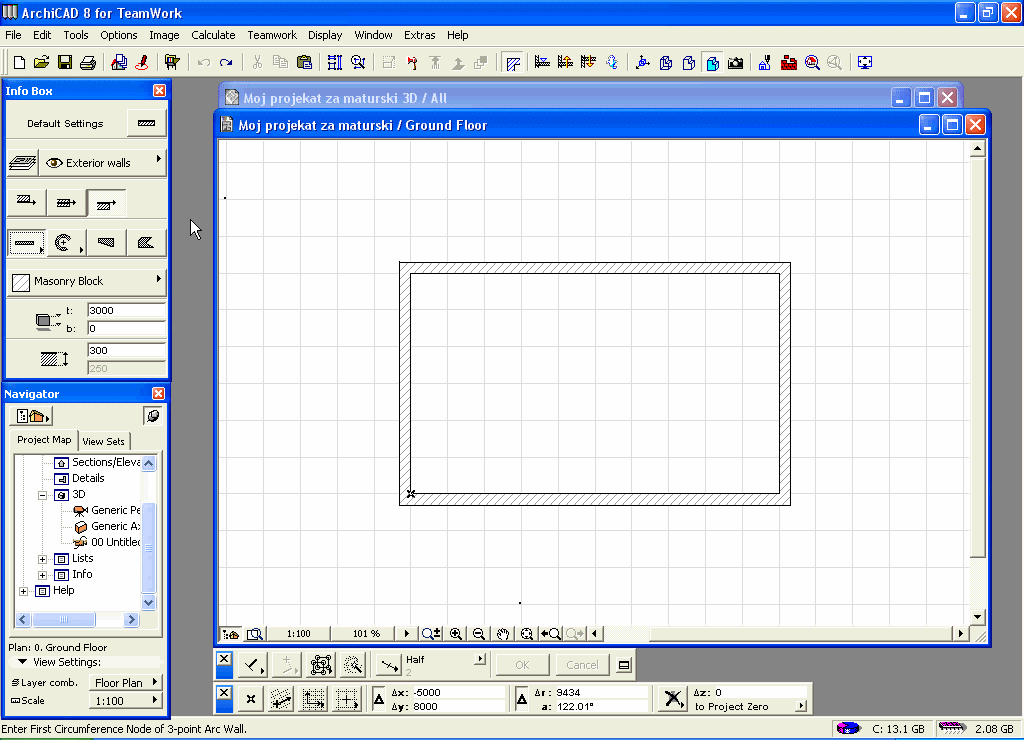 Odaberite odgovarajuću ikonu za zakrivljeni zid (druga ikona u drugom redu) u opcijama za geometrijski metod u Info prozoru.
