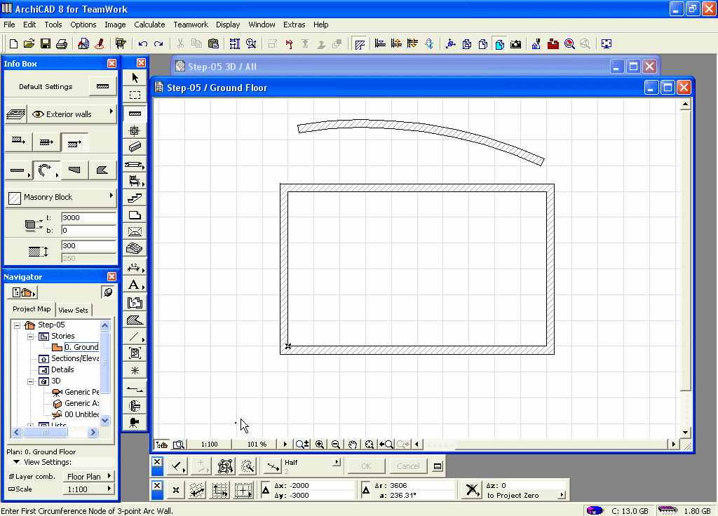 Kliknite na referentnu tačku (sa strane na kojoj je referentna linija zida) na desnom kraju zakrivljenog zida i produžite je.