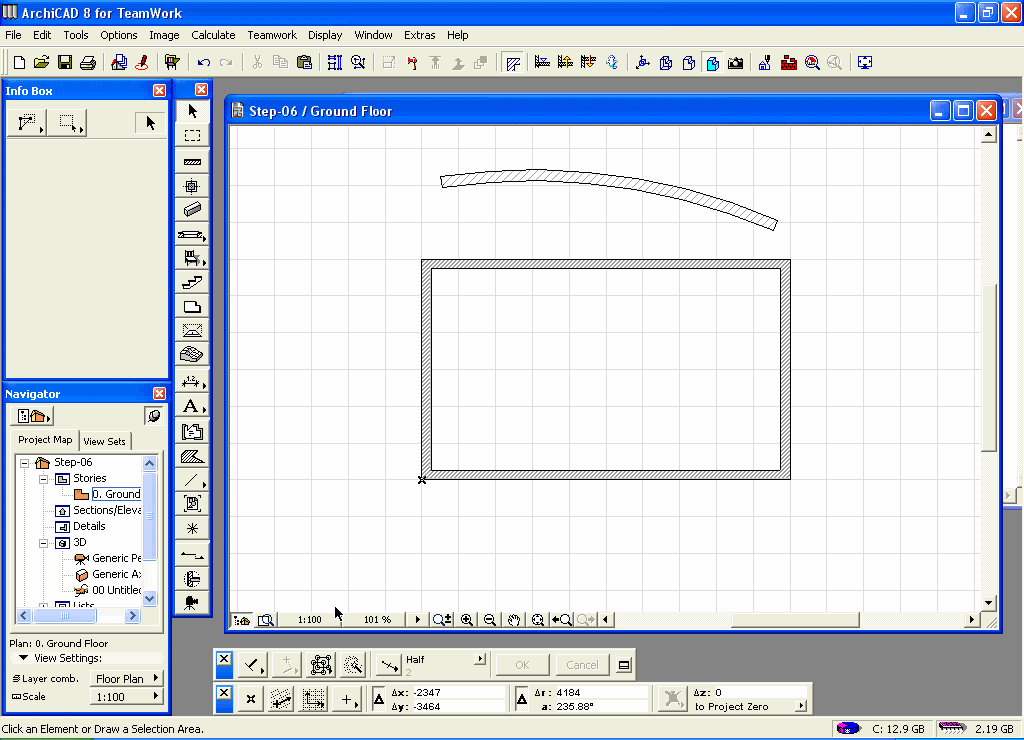 Kliknite na čvornu tačku mreže, dva polja ispod donjeg lijevog ugla objekta.